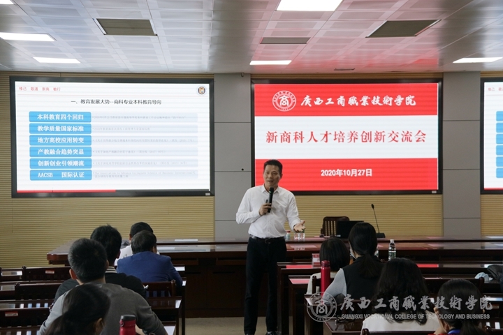 2020年10月27日上午,在鵬飛校區(qū)教學(xué)樓2119會(huì)議室舉辦主題為“新商科人才培養(yǎng)”的創(chuàng)新交流會(huì),并邀請(qǐng)兩位校外專家對(duì)校內(nèi)老師和2020年廣西高職院校技能大賽企業(yè)管理模擬沙盤賽項(xiàng)指導(dǎo)老師進(jìn)行講座和交流指導(dǎo),他們分別是廣西財(cái)經(jīng)學(xué)院人事處處長(zhǎng)(原工商管理學(xué)院院長(zhǎng))梁儒謙教授、南寧師范大學(xué)職業(yè)技術(shù)教育學(xué)院數(shù)字媒體技術(shù)系主任鄭小軍教授。本次交流會(huì)由我校經(jīng)貿(mào)學(xué)院院長(zhǎng)張煌強(qiáng)主持。