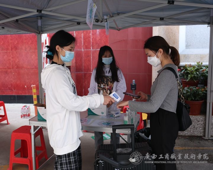 返校當(dāng)日,學(xué)院在鵬飛、中堯、武鳴三個校區(qū)校門口設(shè)置返校學(xué)生進校通道及體溫異常復(fù)檢觀察區(qū)。返校學(xué)生均按要求佩戴口罩,配合教職工志愿者在指定區(qū)域有序排隊,做好行李消殺、口罩更換及消毒,有序掃碼、測溫,掃碼進入宿舍樓等流程,確保進校過程有序安全。