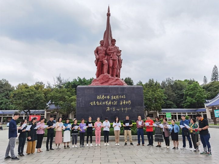 在李明瑞、韋拔群等革命烈士紀(jì)念碑前,全體黨員同志集體誦讀詩歌《紅船的方向》,瞻仰革命烈士群雕,緬懷革命先輩為中國革命事業(yè)英勇獻(xiàn)身的英雄事跡。
