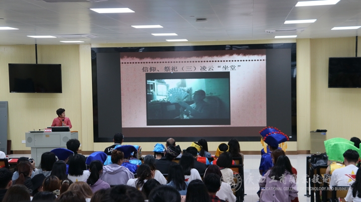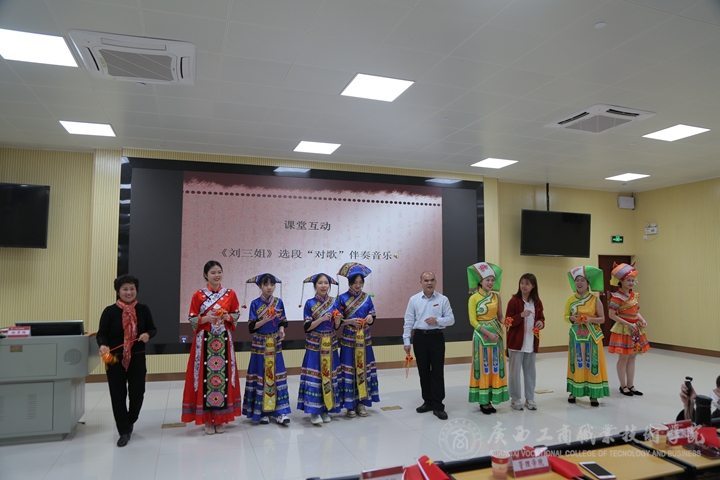 講座在師生合唱的《唱支山歌給黨聽》中拉開帷幕,徐教授從壯族的人口、分布、語言以及民族民歌的文化特征入手,通過在全區(qū)采風(fēng)拍到、錄到的歌圩、對歌的影音資料,與同學(xué)們以互動的形式,共同感受了民歌的過去現(xiàn)在未來,為在場師生講了一場生動的民族文化講座。徐教授講課過程中隨口哼唱的民歌小調(diào),屢屢引得現(xiàn)場師生和聲合唱,引發(fā)了課堂的一個個小高潮。講座上,她以文化品牌“印象劉三姐”為例教育我院學(xué)生,要發(fā)揚(yáng)商院學(xué)科特色,利用好廣西“東盟橋頭堡”的區(qū)位優(yōu)勢,經(jīng)營好“原生態(tài)”的文化產(chǎn)業(yè)。同時要厚植愛國情懷,提升文化自覺、樹立文化自信、不斷提高文化軟實力,保障好文化安全和民族安全?;顒蝇F(xiàn)場,師生們還表演了極具民族特色的竹竿舞、拋繡球和民歌獨唱、對唱節(jié)目。