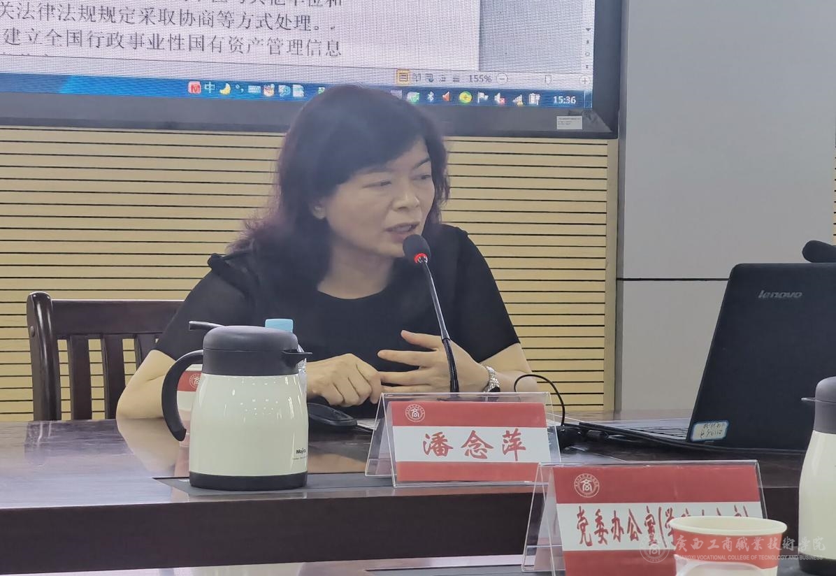 為進(jìn)一步提高學(xué)院國有資產(chǎn)管理水平,增強(qiáng)依法管理國有資產(chǎn)意識,我院于5月12日召開國有資產(chǎn)管理工作培訓(xùn)會。會議由學(xué)院副院長安仲文主持,邀請廣西水利水電職業(yè)技術(shù)學(xué)院總會計(jì)師潘念萍(正高級會計(jì)師)作《高校國有資產(chǎn)管理政策解讀及存在問題解決思路》專題培訓(xùn),學(xué)院各部門、各單位負(fù)責(zé)資產(chǎn)管理工作的領(lǐng)導(dǎo)、資產(chǎn)管理員及學(xué)院國有資產(chǎn)管理處全體成員參加了會議。