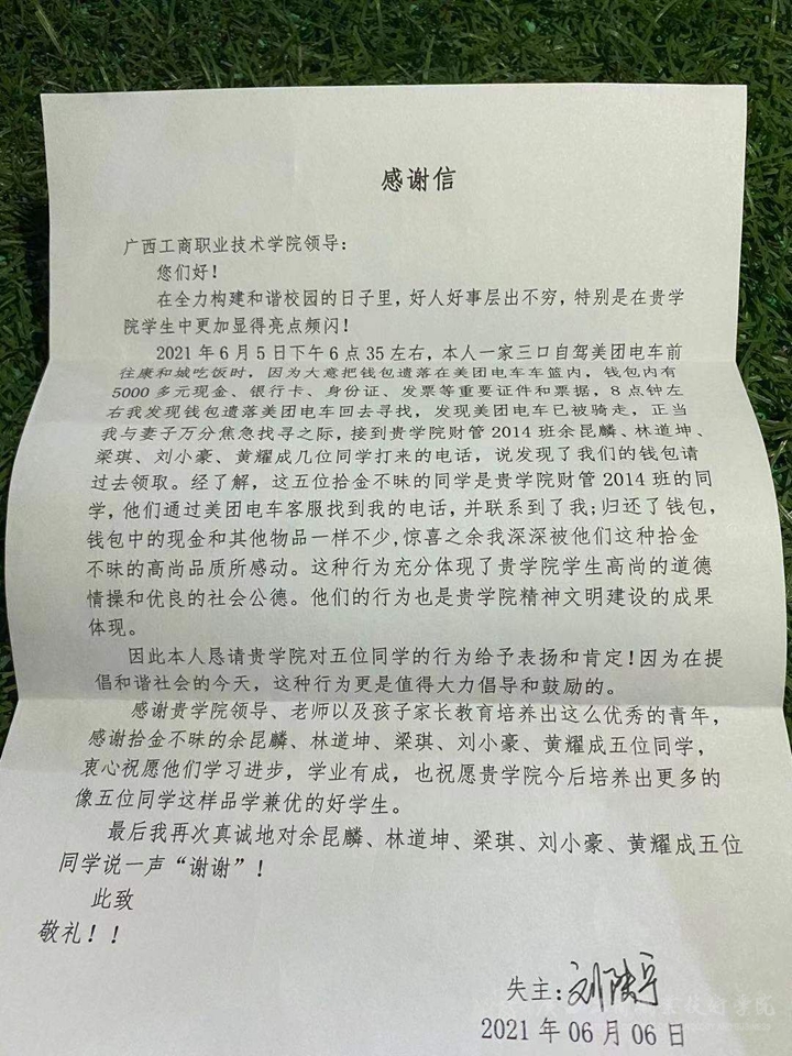 在得知自己遺失提包的消息時,劉先生十分感激得向同學們表達了謝意,并于次日特意趕到我院武鳴校區(qū)送來了錦旗和感謝信。財金學院通過主題班會等形式對同學們這種拾金不昧的行為進行了表揚,號召全體同學學習他們拾金不昧的精神,樹立正確的價值觀、道德觀,不斷提高自身思想素質(zhì)和道德情操,為社會主義精神文明建設做出自己的貢獻。