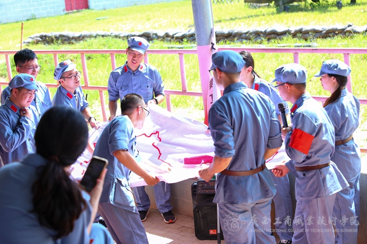 培訓(xùn)班還組織開展了體驗(yàn)教學(xué)環(huán)節(jié)。6月18日,學(xué)員們身著紅軍服、手握紅纓槍,現(xiàn)場(chǎng)“重走長征路”,分組建立各路方面軍,模擬體驗(yàn)了瑞金出征、湘江戰(zhàn)役、遵義會(huì)議、飛奪瀘定橋、重走長征路、勝利大會(huì)師等長征歷史中可歌可泣的故事,為中國共產(chǎn)黨成立100周年獻(xiàn)禮。