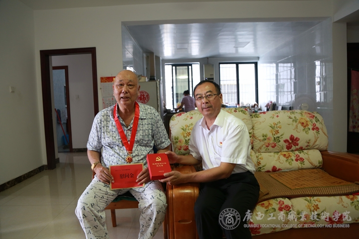 6月28日,蒙啟成帶隊(duì)來到81歲的老黨員覃澤光同志家中,與老人拉家常、聊生活、談發(fā)展,細(xì)心詢問覃老師身體狀況如何,精神狀態(tài)如何,叮囑他要時(shí)刻注意保重身體,適度鍛煉,同時(shí)要保持樂觀積極心態(tài)。蒙副書記為覃老師佩戴在黨50周年紀(jì)念章,并送上慰問金向他致以節(jié)日祝福。