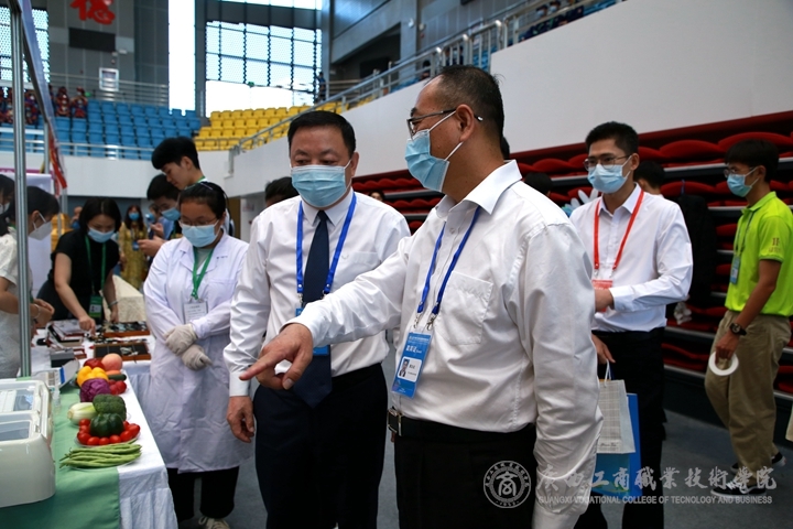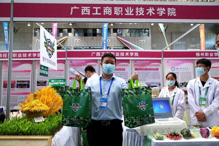 本屆展會(huì),我院的展位設(shè)計(jì)以“糧·商”特色為主,學(xué)院總體發(fā)展定位為“糧·商"同步推進(jìn),以建設(shè)高水平糧油食品專業(yè)群為龍頭,帶動(dòng)新工科、新商科專業(yè)集群體系建設(shè),積極探索構(gòu)建“多元參與、校企雙主體"的產(chǎn)教融合模式。展位上,糧油食品專業(yè)的老師帶領(lǐng)學(xué)生為嘉賓展示糧食農(nóng)藥殘毒監(jiān)測技術(shù)并講解,這是糧食副產(chǎn)物精深加工的科研成果;南寧市軍糧供應(yīng)站像嘉賓展示了校企合作研發(fā)的產(chǎn)品。學(xué)院黨委副書記蒙啟成帶領(lǐng)參展嘉賓來到我院展區(qū)查看現(xiàn)場,為現(xiàn)場各領(lǐng)導(dǎo),嘉賓等一一介紹了我院的產(chǎn)品。師生的作品受到了上級(jí)領(lǐng)導(dǎo)及各國嘉賓的高度認(rèn)可。