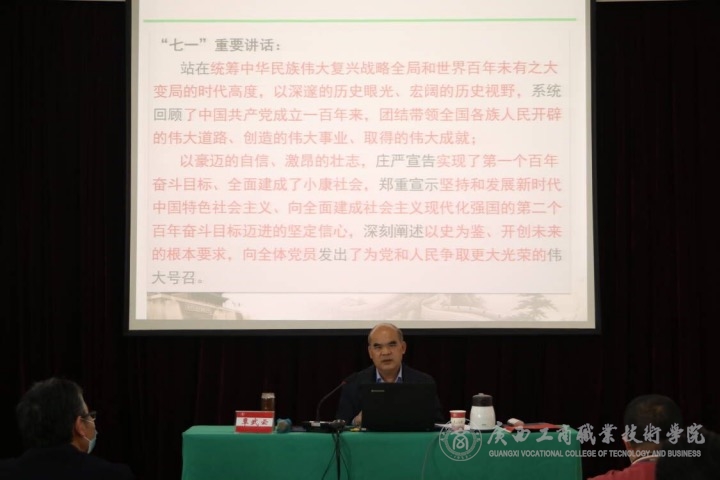 11月13日下午,在“沒有共產(chǎn)黨就沒有新中國”的洪亮歌聲中,學(xué)院黨委覃武云書記來到鵬飛校區(qū)2145會(huì)議室,為第四期青年馬克思主義者培養(yǎng)工程培訓(xùn)班學(xué)員和全體學(xué)生黨員講授了黨史學(xué)習(xí)教育專題黨課。本次授課采取“線上+線下”結(jié)合的方式進(jìn)行,各二級(jí)學(xué)院黨總支書記和第四期青馬班學(xué)員及147名三年級(jí)學(xué)生黨員在現(xiàn)場聽課,456學(xué)生黨員在線同步收看了課程直播。