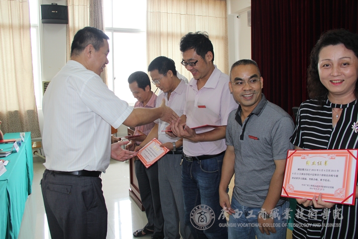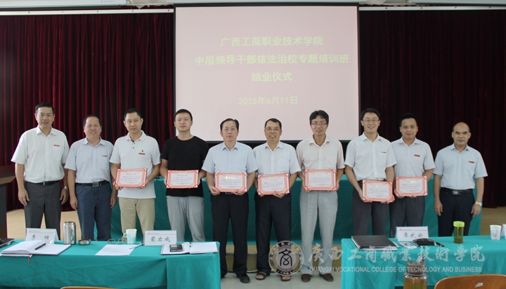 2015 年 6 月 11日下午,我院在校本部教學樓報告廳舉辦中層領導干部依法治校專題培訓班結業(yè)儀式。學院領導覃武云、蒙啟成、李仕欽、李維出席,學院中層以上領導干部參加。儀式由蒙啟成副書記主持。