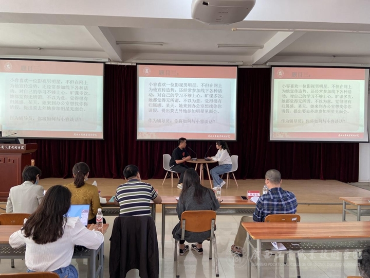 本次大賽共有41名專職輔導(dǎo)員參加,分初賽和決賽兩個階段進行。初賽以基礎(chǔ)知識測試形式考查參賽選手們在學(xué)生工作方面的理論知識儲備和專業(yè)技能素養(yǎng)。經(jīng)過激烈角逐,共有5名輔導(dǎo)員脫穎而出進入決賽。決賽以“談心談話”形式開展,參賽選手們結(jié)合自身工作實際和職業(yè)素養(yǎng),圍繞大學(xué)生思想政治教育、就業(yè)指導(dǎo)、日常管理、疫情防控、心理健康等學(xué)生工作重點、熱點、難點問題進行了情景模擬和理論探討。輔導(dǎo)員們以扎實的理論功底和深厚的職業(yè)素養(yǎng)贏得了在場師生的好評。