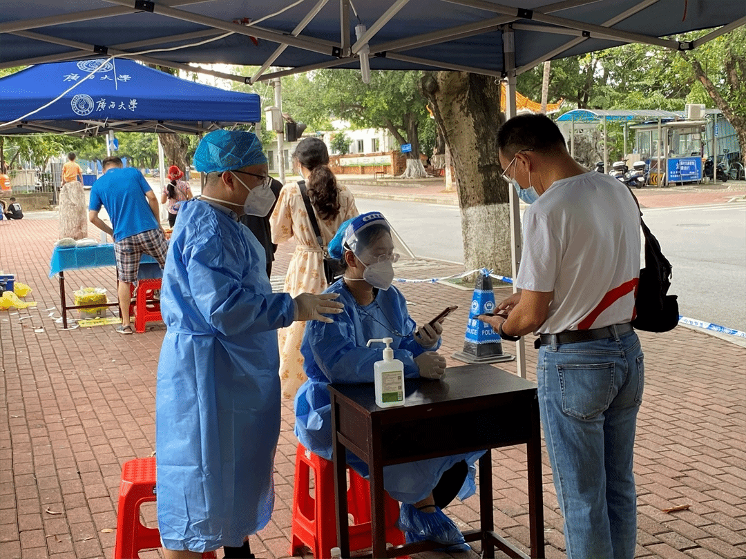 2022年7月以來,受疫情影響,南寧市出現(xiàn)了新冠肺炎本土感染者病例。為了保障人民的生命安全,南寧市主城區(qū)于7月19日--23日開展全員核酸檢測工作,社區(qū)防疫抗疫工作嚴(yán)峻。為此,我校馬克思主義學(xué)院教師積極報名參加防疫抗疫志愿工作,他們深入社區(qū),深入抗擊疫情一線,協(xié)助社區(qū)工作人員登記外來人員信息并測體溫、上門入戶幫助社區(qū)居民完成二維碼錄入,協(xié)助醫(yī)務(wù)人員進行核酸檢測、維持檢測點工作秩序、引導(dǎo)居民采樣等志愿服務(wù)工作,以實際行動踐行初心使命,彰顯了責(zé)任擔(dān)當(dāng)。