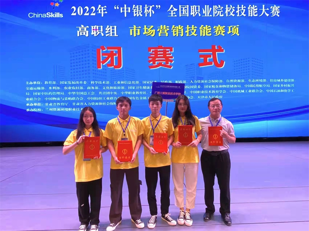 2022年8月25—26日,由教育部等多個部門聯(lián)合主辦的2022年全國職業(yè)院校技能大賽高職組“市場營銷技能”賽項在甘肅蘭州資源環(huán)境職業(yè)技術(shù)大學(xué)舉行。經(jīng)過緊張激烈角逐,由劉結(jié)玲、張煌強(qiáng)兩位老師指導(dǎo),馬志才、熊孟杰、趙嘉林、陳心雨四位同學(xué)組成的團(tuán)隊代表廣西壯族自治區(qū)參賽,經(jīng)過兩天全力比拼,在全國56所高職院校中脫穎而出,喜獲二等獎。