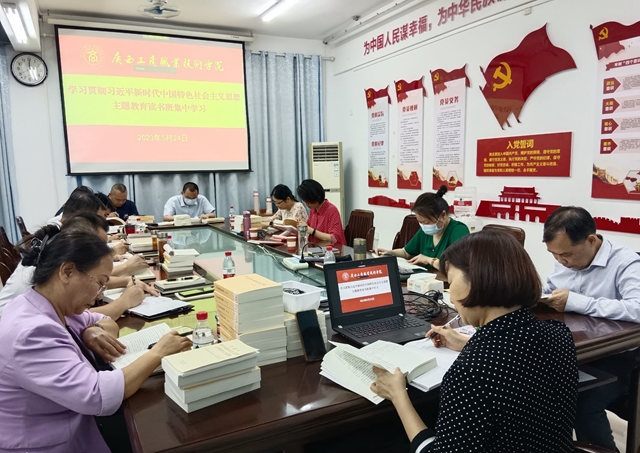 在鵬飛校區(qū)多個會議室和“紅灣”主題閱讀體驗區(qū),同志們凝心靜氣,認(rèn)真研讀黨的二十大報告、中國共產(chǎn)黨章程、《習(xí)近平著作選讀》《習(xí)近平新時代中國特色社會主義思想專題摘編》等必讀書目和《習(xí)近平新時代中國特色社會主義思想學(xué)習(xí)綱要》等選讀書目,拓展學(xué)習(xí)習(xí)近平總書記在主題教育工作會議上的重要講話、習(xí)近平總書記對廣西“五個更大”重要要求等關(guān)于廣西地區(qū)和教育領(lǐng)域的特色材料。