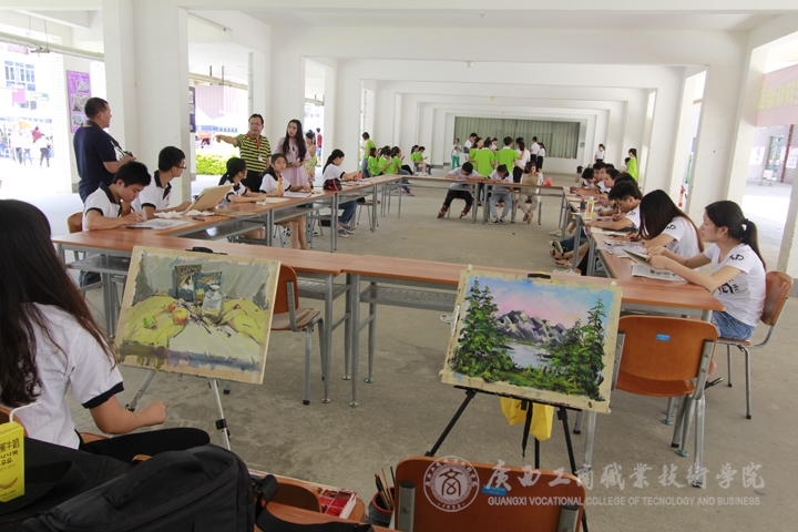 不遠(yuǎn)處,宿舍樓架空層的技能展示正在進(jìn)行?!柏斝畔诞厴I(yè)生學(xué)生作品展”則現(xiàn)場展示了廣告設(shè)計與制作專業(yè)同學(xué)嫻熟而獨具創(chuàng)意的設(shè)計和室內(nèi)設(shè)計技術(shù)專業(yè)學(xué)生現(xiàn)場素描和水粉作畫的本領(lǐng)。