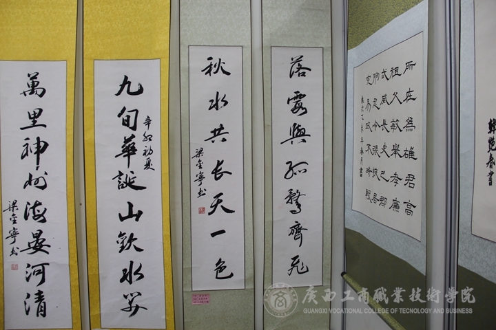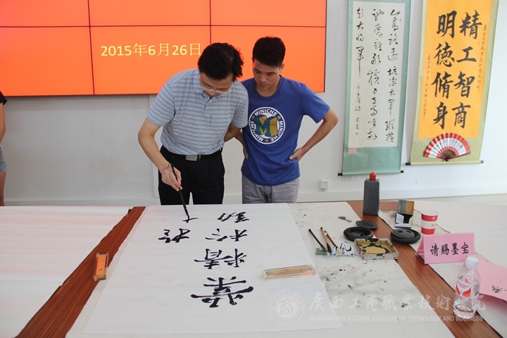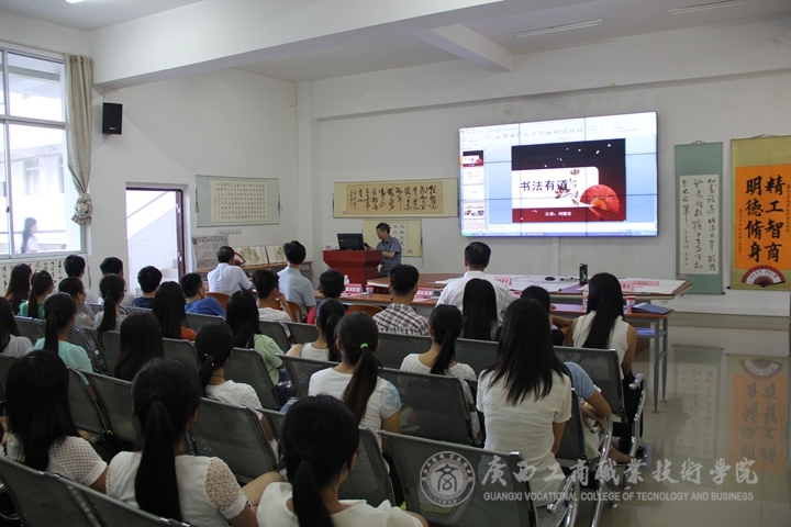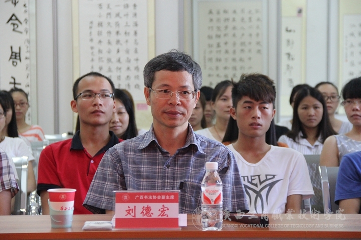 此次書法講座會(huì)上,廣西書法家協(xié)會(huì)常務(wù)副主席劉德宏上臺(tái)給在場(chǎng)各位講評(píng)了“書法有道”的概念。同大家觀看了一些自己的書法作品并熱情的與大家分享自己的創(chuàng)作心得以及自己在書法道路上的故事。接著自治區(qū)糧食局人事處處長韋尚英上臺(tái)發(fā)表講話,向大家講起了往年自己參加的一些書法比賽,就如何提高同學(xué)們對(duì)書法的興趣、書法基礎(chǔ)要領(lǐng)、如何寫好書法等問題做了詳細(xì)的講解并給同學(xué)們示范了一些字的點(diǎn)筆與勾勒。