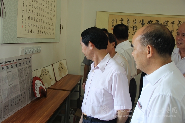 (學(xué)院領(lǐng)導(dǎo)陪老領(lǐng)導(dǎo)參觀我院書法展)
