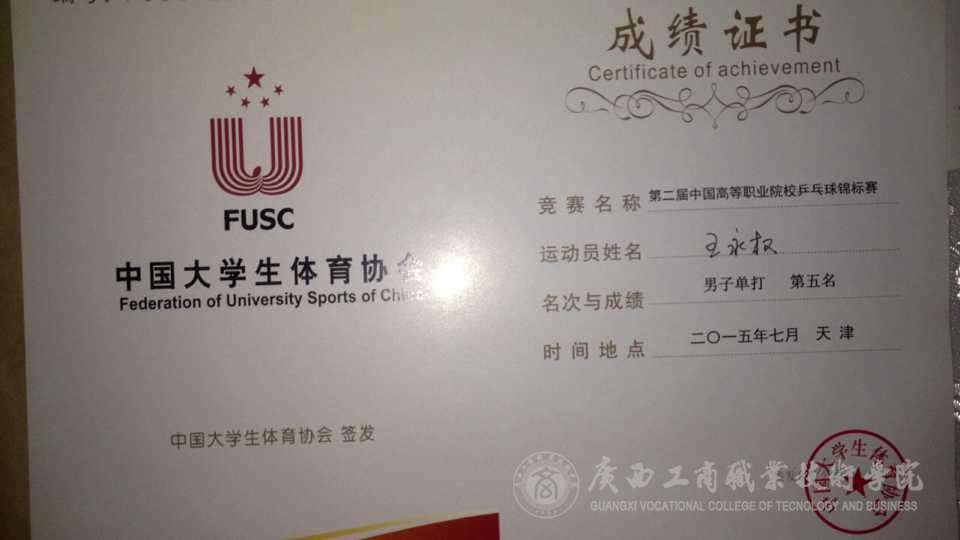 第二屆全國(guó)高等職業(yè)院校乒乓球錦標(biāo)賽于2015年7月20-23日在天津電子信息職業(yè)技術(shù)學(xué)院舉行。我院派出了由會(huì)計(jì)系稅會(huì)1432班王永權(quán)、會(huì)審1331班潘凌歡、會(huì)審1432班鄭琪雲(yún)、經(jīng)管系工商1434班黃瑞和、營(yíng)銷(xiāo)1331班趙海榮同學(xué)組成的學(xué)院代表隊(duì),赴天津參加了本次高職乒乓球盛會(huì)。我院代表隊(duì)在比賽中發(fā)揚(yáng)了良好的體育道德精神,互相鼓勵(lì),頑強(qiáng)拼搏,經(jīng)過(guò)4天激烈角逐,獲得了男子團(tuán)體第五名的驕人成績(jī),創(chuàng)造了我院參加全國(guó)體育比賽的最好名次。同時(shí),在有187名運(yùn)動(dòng)員所參加的男子單打比賽中,我院王永權(quán)同學(xué)憑著多變的戰(zhàn)術(shù),穩(wěn)定的心理,頑強(qiáng)的精神,兇狠的打法,連克強(qiáng)手,榮獲男子單打第五名。