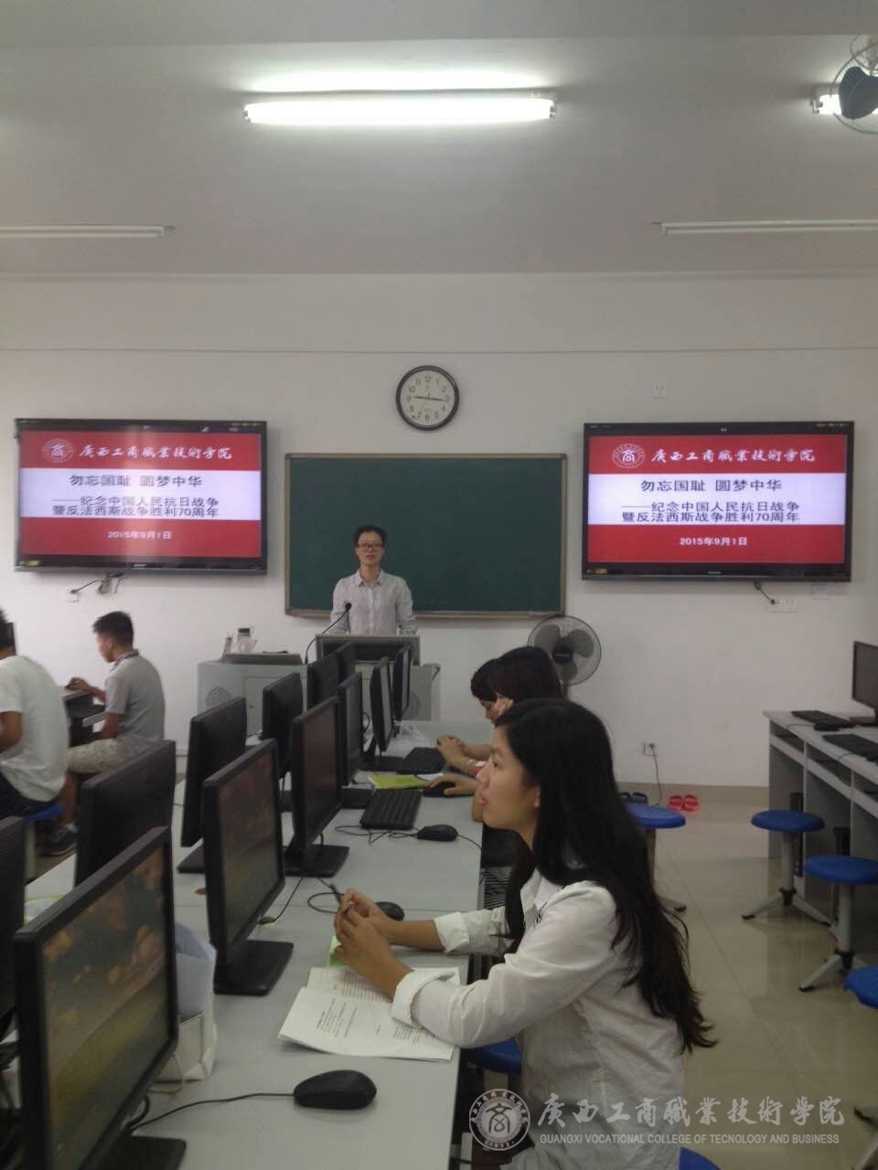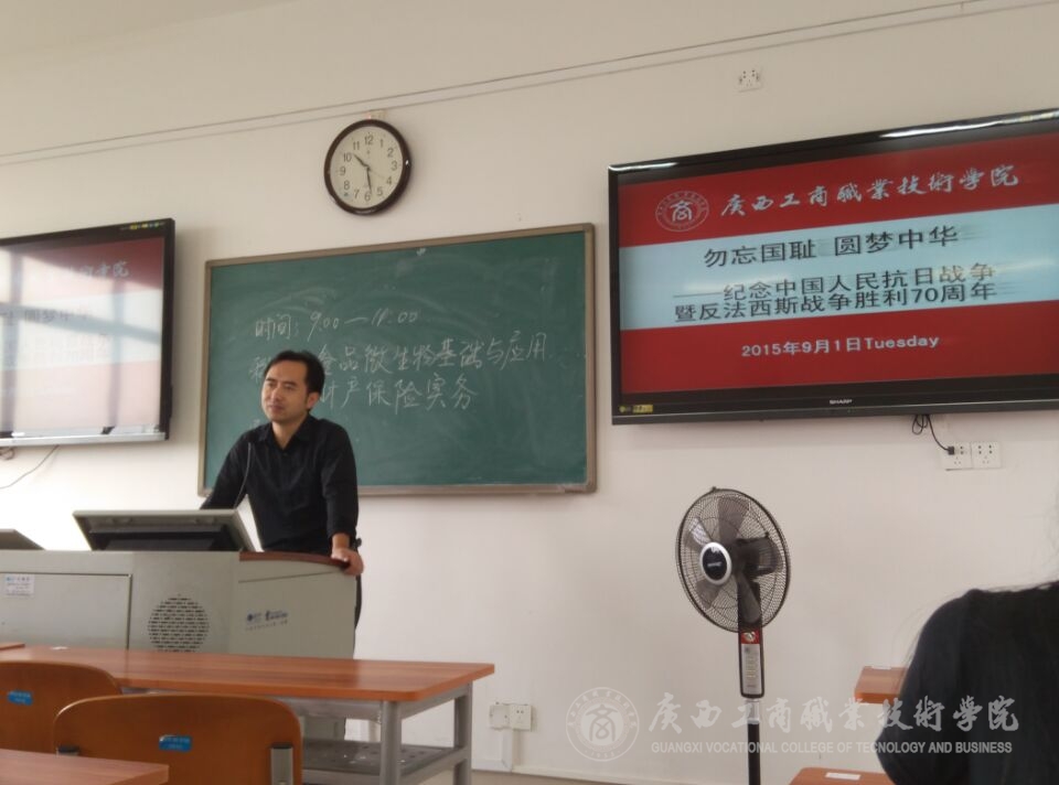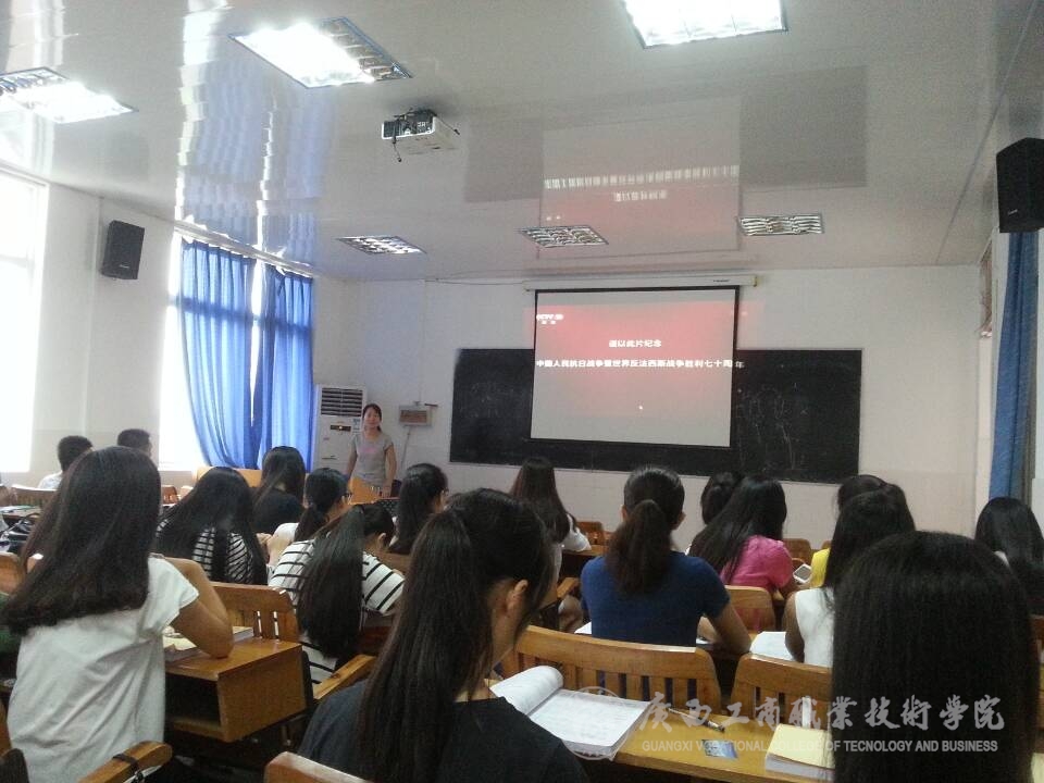 在開學(xué)的第一周中,我系教師在同學(xué)們的假期結(jié)束返校的第一課上,利用課前10分鐘或者課間10分鐘,為同學(xué)們簡單的講述了抗日戰(zhàn)爭的歷史以及抗戰(zhàn)勝利的偉大意義,并為同學(xué)們播放了由中央電視臺、軍事科學(xué)院政治部、江蘇省廣播電視總臺、陜西廣播電視臺等單位聯(lián)合拍攝的八集大型紀(jì)錄片《東方主戰(zhàn)場》的第一集《東方危急》的一小段,并讓同學(xué)們利用課余的時間,自行觀看這部紀(jì)錄片,了解歷史,勿忘國恥,要繼承和弘揚抗日民族統(tǒng)一戰(zhàn)線優(yōu)良傳統(tǒng)。