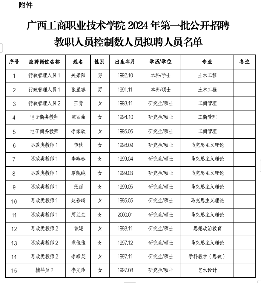 附件:廣西工商職業(yè)技術(shù)學(xué)院2024年第一批公開招聘教職人員控制數(shù)人員擬聘人員名單