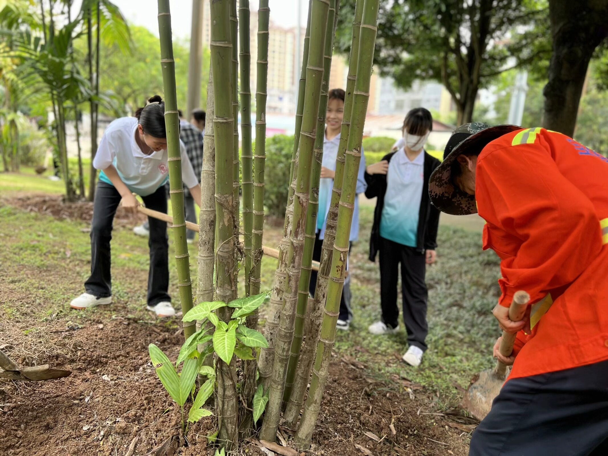 圖為: 同學(xué)們向園林工人學(xué)習(xí)圍土知識(shí)