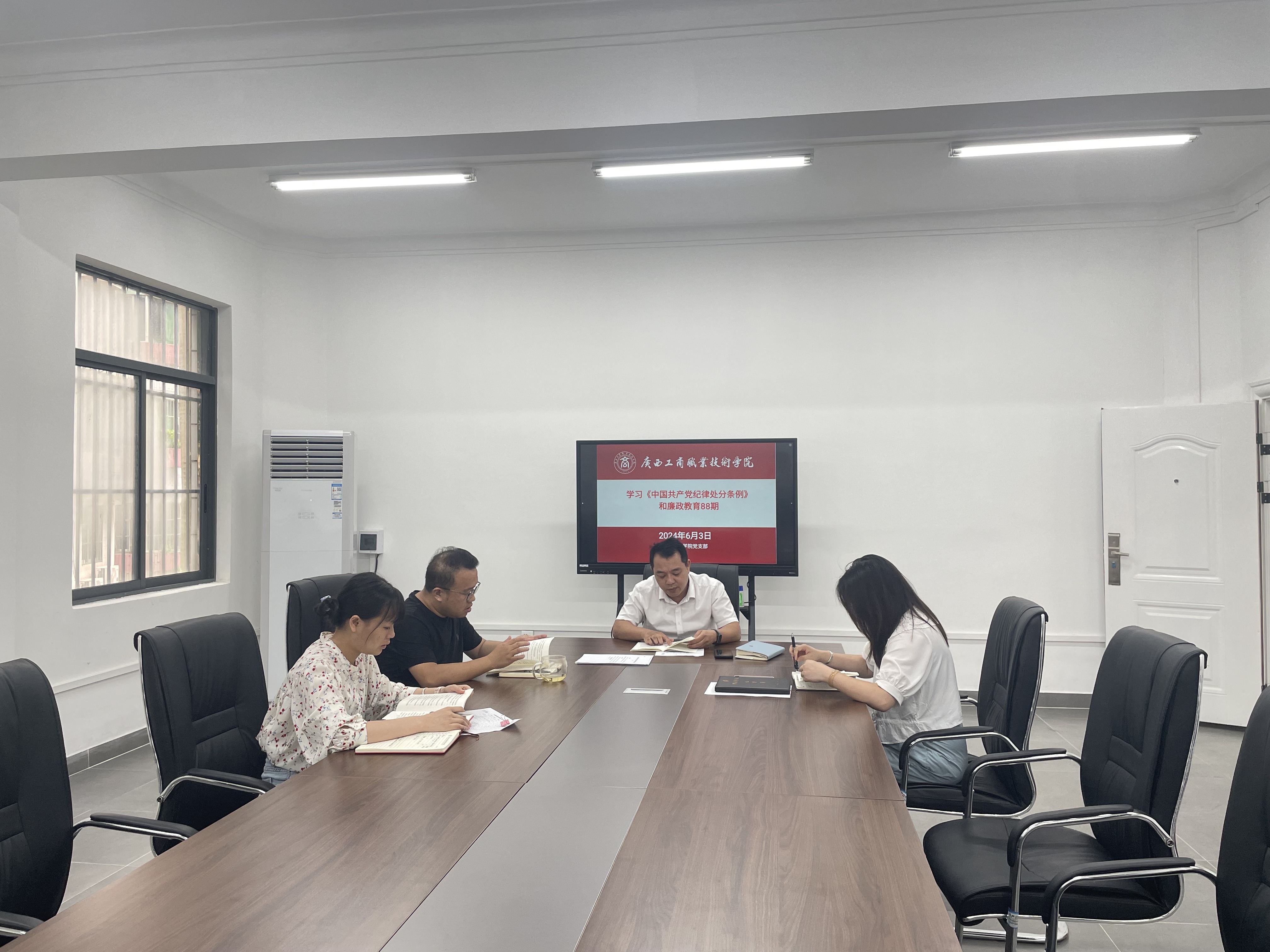 李朝鋒書記帶領(lǐng)大家原原本本地學(xué)習(xí)了《中國(guó)共產(chǎn)黨紀(jì)律處分條例》的內(nèi)容,結(jié)合部門實(shí)際情況,邊學(xué)習(xí)邊解讀,他要求大家以高度的政治自覺(jué)、思想自覺(jué)和行動(dòng)自覺(jué),深刻理解和把握《條例》的精神實(shí)質(zhì),用以規(guī)范自身的一言一行。隨后,李朝鋒書記領(lǐng)學(xué)廣西工商職業(yè)技術(shù)學(xué)院紀(jì)委辦公室、監(jiān)察室編制的廉政教育第88期內(nèi)容,從嚴(yán)重違紀(jì)違法的案例解讀中,要求大家把紀(jì)律放心上,堅(jiān)定理想信念,嚴(yán)格遵守黨紀(jì)黨規(guī),守住紀(jì)律“底線”。