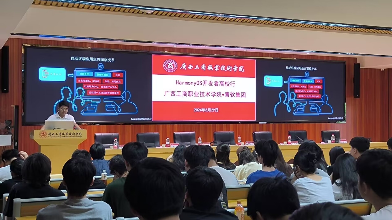 2024年5月29日上午,HarmonyOS開(kāi)發(fā)者高校行開(kāi)營(yíng)儀式在鵬飛校區(qū)2145會(huì)議室順利舉行。本次活動(dòng)由信息與設(shè)計(jì)學(xué)院牽頭,青軟創(chuàng)新科技集團(tuán)股份有限公司承辦。廣西工商職業(yè)技術(shù)學(xué)院副校長(zhǎng)闕勇平,青軟創(chuàng)新科技集團(tuán)股份有限公司兩廣總監(jiān)王建松,信息與設(shè)計(jì)學(xué)院院長(zhǎng)張麗勇,副院長(zhǎng)唐燕雯等師生代表180余人參加了此次開(kāi)營(yíng)儀式,活動(dòng)由信息與設(shè)計(jì)學(xué)院院長(zhǎng)張麗勇主持。