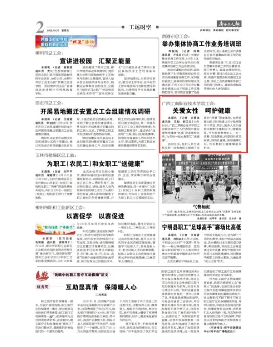 本報(bào)訊 (記者 農(nóng)晨迪? 通訊員 王如 舒江云)??10月16日,廣西工商職業(yè)技術(shù)學(xué)院聯(lián)合南寧工人療養(yǎng)院開展關(guān)愛女性健康“兩癌”篩查體檢服務(wù),為該校一線女教職工“送健康”。