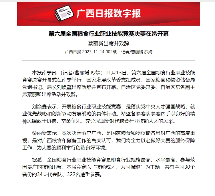 上一條: 【經(jīng)濟參考報】第六屆全國糧食行業(yè)職業(yè)技能競賽決賽在南寧舉行