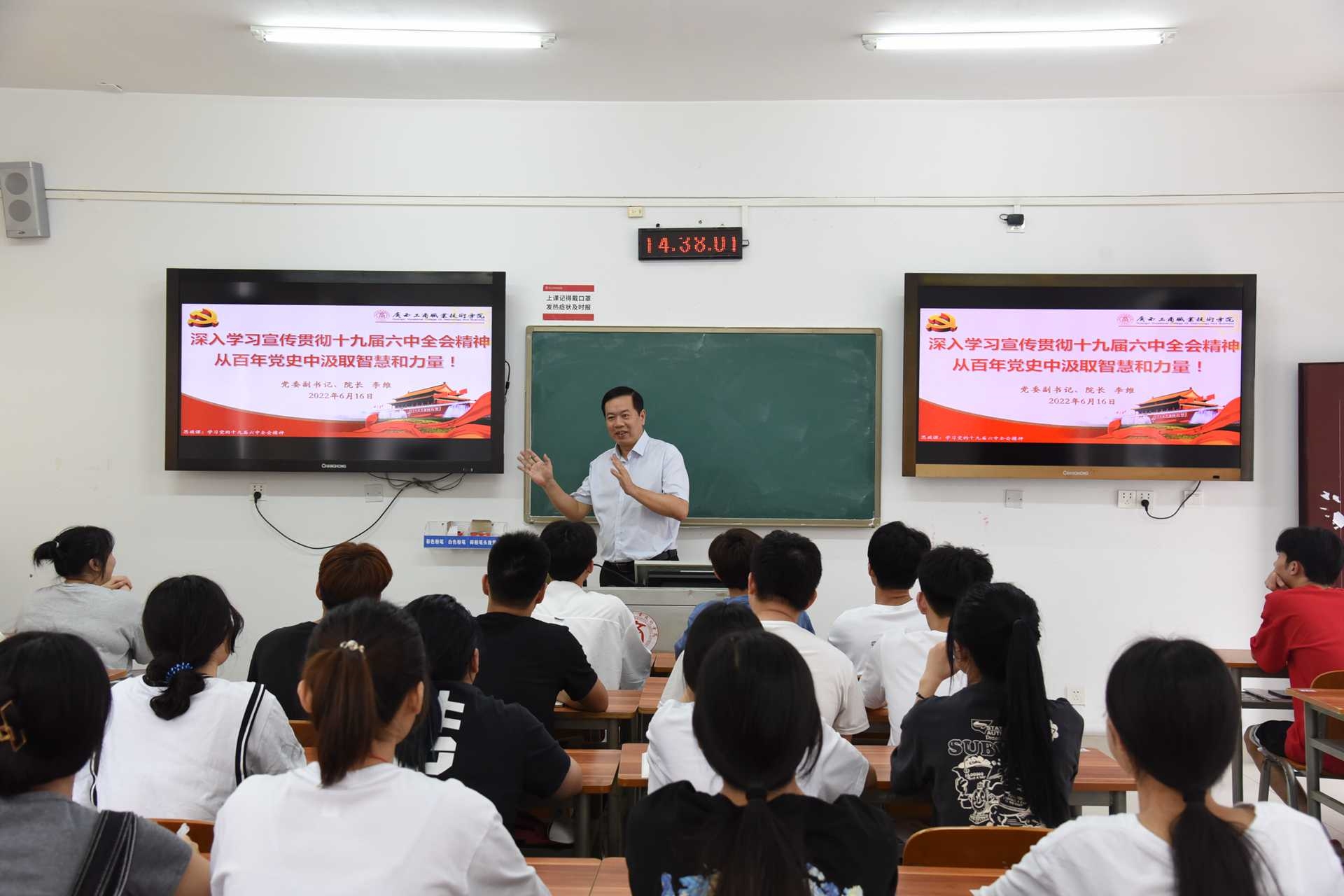 • 6月16日下午,學(xué)院黨委副書記、院長李維在鵬飛校區(qū)為21級室內(nèi)專業(yè)學(xué)生講授題為《深入學(xué)習(xí)宣傳貫徹十九屆六中全會精神——從百年黨史中汲取智慧和力量》的思政課。李維院長從為什么要做這個《決議》——總結(jié)黨的百...