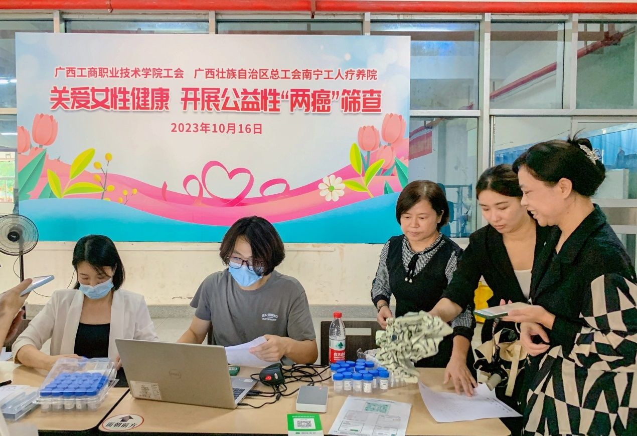 • 10月16日下午,學(xué)院與廣西壯族自治區(qū)總工會(huì)南寧工人療養(yǎng)院在鵬飛校區(qū)開展“關(guān)愛女性健康 開展公益性‘兩癌’?篩查”體檢服務(wù),為學(xué)院一線女教職工體檢。(活動(dòng)現(xiàn)場)開展公益性“兩癌 ”篩查服務(wù)活動(dòng)是自治區(qū)總工...