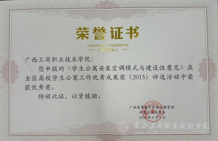 • 近日,在廣西高等教育學(xué)會后勤管理研究專業(yè)委員會組織舉辦的全區(qū)高校學(xué)生公寓工作優(yōu)秀成果獎(2015)評選活動中,我院黨委學(xué)生工作部(學(xué)工處)申報的《學(xué)生公寓安裝空調(diào)模式與建設(shè)性意見》榮獲優(yōu)秀獎。 ...