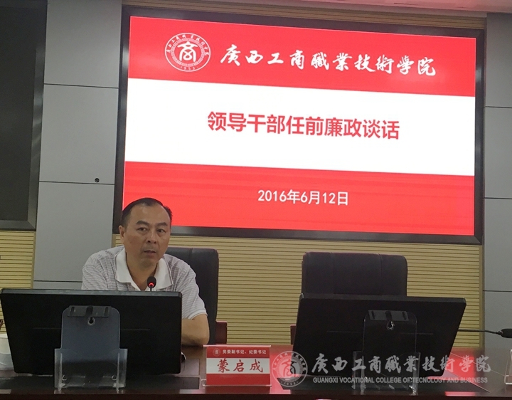 • 2016年6月12日下午,學(xué)院黨委副書記、紀委書記蒙啟成同志對6位新調(diào)整工作崗位的處級干部做任前廉政談話。會上,蒙啟成對6位處級領(lǐng)導(dǎo)干部提出了四點要求:一是認真履行黨風(fēng)廉政建設(shè)“一崗雙責(zé)”責(zé)任,管好自己部門...